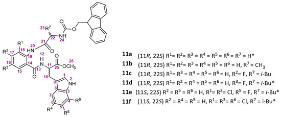 Then, the acid chlorides required for the synthesis of the tripeptides 11a–11f were synthesized from their respective 9-fluorenylmethoxycarbonyl (Fmoc)-protected amino acids by treatment with SOCl2 in dry CH2Cl2 (Scheme 1) [30]. It was possible to obtain three acid chlorides: Fmoc-Gly-Cl (10a), Fmoc-L-Ala-Cl (10b), and Fmoc-L-Leu-Cl (10c). Afterwards, the synthesis of the linear tripeptides 11a–11f (Figure 5) was achieved via coupling of the linear dipeptides 8a–8e with the respective Fmoc-protected acid chlorides (10a–10c) [27]. This reaction was performed under two-phase Schotten–Baumann conditions in which an aqueous base (Na2CO3) solution was added that would act as a catalyst and shift the equilibrium towards the formation of the tripeptide while also neutralizing the HCl formed in the reaction, preventing the further protonation of the product that remained in the organic phase.