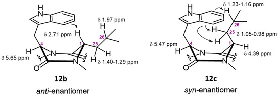 In addition, the signal associated with H-1 had a chemical shift of 2.71 ppm, which was coherent with the values reported in the literature for similar compounds, namely for the anti-enantiomers. For the anti-enantiomers, as was the case of 12a and 12b, the chemical shifts of the signal associated with H-1 (δ = 2.73 and 2.71 ppm) were lower than those obtained for the syn-enantiomers 12c and 12d (δ = 4.39 and 4.24 ppm). As is shown in Figure 7, this likely occurred due to the folding of the indolyl substituent over the piperazine ring, in which the aromatic ring of the indolyl substituent would have a shielding effect over H-1 in the anti-enantiomers. On the contrary, in the syn-enantiomers, this shielding effect was observed in the signals associated with H-25 and H-26 from the isobutyl substituent (δ 2.04–1.29 ppm for the anti-enantiomers and δ 1.23–0.66 ppm for the syn-enantiomers). This effect had already been reported by Hernandez et al. [33] in similar compounds. Therefore, the analysis of these signals indicates that the compounds did not suffer epimerization during the synthetic process. Melting points and optical rotation of the final derivatives were also measured to further characterize the compounds. The purity of all the compounds tested for biological activity was assessed by high-performance liquid chromatography with photodiode-array detection (HPLC-DAD) (Table 1) (HPLC Data—Tables S1 and S2, Supplementary Materials).