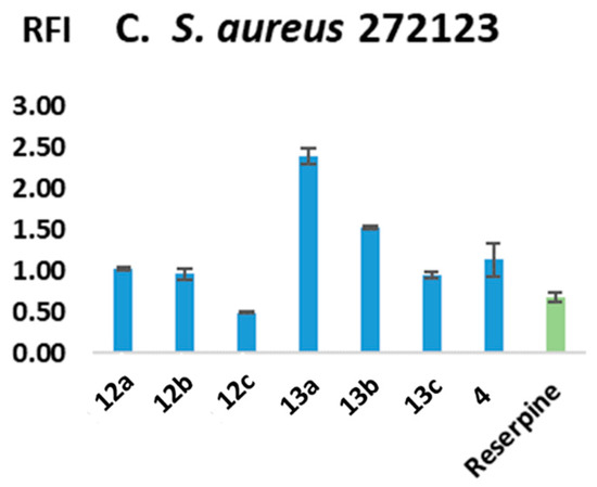 Concerning EPI activity, several compounds showed higher RFI values than the positive controls in the ethidium bromide accumulation assay, suggesting that they might show potential as efflux pump inhibitors. In this assay, compound 12c seemed to be the most potent, showing promising RFI values in all three bacterial strains tested. Moreover, compounds 4 and 13a–13c, for example, were very effective at reducing the formation of MRSA biofilms (81–91% inhibition rates).