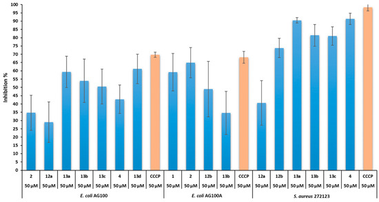 The antibiofilm effect of the tested compounds was evaluated using the crystal violet method on E. coli AG100, E. coli AG100A, and MRSA 272123. Compounds 2, 4, 12a, and 13a–13d reduced the amount of biofilm formed by E. coli AG100 when tested at a 50 μM concentration. Furthermore, 13d was the most potent derivative, reducing the biofilm formation by 61%. In the case of E. coli AG100A, which lacked the AcrAB–TolC system, compounds 1, 2, and 12b proved to be more effective, with compound 2 reducing biofilm formation by 65%. On the contrary, the antibiofilm activity shown by compounds 4 and 13a–13d towards E. coli AG100 was greatly reduced towards the mutant E. coli AG100A strain.Regarding MRSA 272123, 13a and 4 were the most effective derivatives, decreasing biofilm formation by 91%. The results for the compounds that showed the highest antibiofilm capacity are summarized in Figure 10. CCCP was used as a positive control.