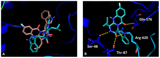 Upon first glance, it could be noted that the most favorable poses of the compounds were opposite one another, as can be seen in Figure 12A. Compound 12a was predicted to establish hydrogen interactions with the polar amino acids Ser-48, Thr-87, Gln-176, and the positively charged Arg-620 (Figure 12B). On the other hand, compound 12b appeared to establish interactions with the polar Gln-176 and Asn-274, and the negatively charged Glu-273. These interactions were in accordance with what was predicted for other compounds with a tricyclic scaffold, such as xanthones and thioxanthones [34,44]. Additionally, docking studies with known AcrB inhibitors, such as minocycline and doxorubicin, have shown predicted interactions with Gln-176, suggesting the importance of this residue in the interaction with inhibitors [42].