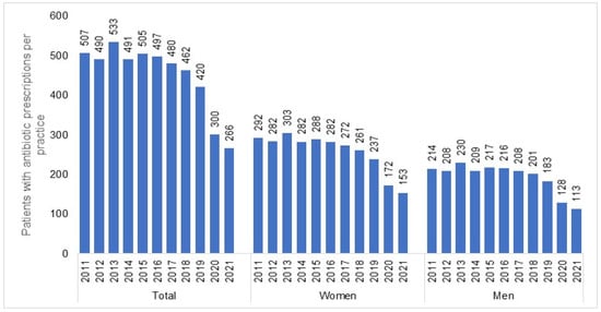 Number of patients (total, women, and men) with at least one antibiotic prescription per practice in 2012–2021.
