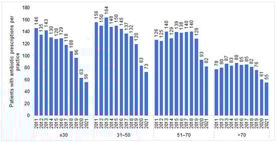 The number of individuals who visited one of the 477 GP practices included in our study increased from 1,085,418 in 2011 to 1,442,999 in 2021. In total, 1,165,642 patients received antibiotic prescriptions throughout the entire study period (mean age: 51.8; standard deviation: 18.4 years; 55.3% females). In all years investigated, women received more AB prescriptions than men (e.g., 2011: 292 prescriptions per practice for women versus 214 prescriptions per practice for men; 2021: 153 prescriptions per practice for women versus 113 prescriptions per practice for men). We observed a negative trend in the number of patients with an AB prescription (Figure 1), starting in 2015 (505 patients per practice) and persisting until 2021 with the most significant decreases recorded in 2020 (300 patients per practice) and 2021 (266 patients per practice) (Table 1). This sharp drop was observed in both women and men (Figure 1) and across all age groups (Figure 2). However, while (≤30) the decrease in the youngest age group was from 128 patients per practice in 2015 to 56 patients per practice in 2021 (−56%), the decline in the age group >70 was weaker, dropping from 88 patients per practice in 2015 to 55 patients per practice in 2021 (−38%) (Figure 2).
