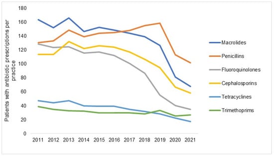 Number of patients with at least one antibiotic prescription per practice in 2012–2021 by antibiotic drug class.