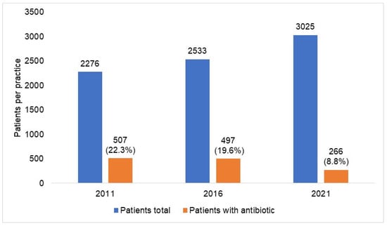 Prevalence of antibiotic prescription in 477 general practices in 2011, 2016, and 2021. In general, from 2011 to 2021, the absolute frequency of patients treated per practice increased from 2276 to 3025, and the percentage of those treated with antibiotics decreased from 22.3% to 8.8%.