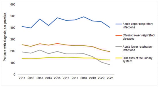 Finally, Figure 5 shows the number of patient diagnoses for one of the diseases which are often listed as a reason for an AB prescription. No clearer negative trend could be seen between 2011 and 2019 (Table 1), with the number of diagnoses only decreasing in 2020 and 2021 compared to 2019. For example, in 2021, 46% fewer patients were diagnosed with acute lower respiratory infections, 19% fewer with chronic lower respiratory diseases, and just 10% fewer with diseases of the urinary system (Figure 5).