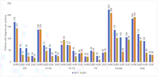 Figure 6 shows the number of patient diagnoses for one of the diseases which are often listed as a reason for an AB prescription in 2011 and 2021 by sex and age. Women were diagnosed with acute lower respiratory tract infections and infectious diseases of the urinary system more frequently than men.