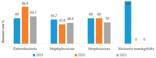 Figure 3 showed that unlike almost all others groups of bacteria where the resistance burden was quite constant or slightly decreasing over years, the Enterobacteriaceae exhibited greater resistance rate during the pandemic period [60% (48/80) in 2019 vs. 86.9% (60/69) in 2020 and 64.2% (61/95) in 2021]. Furthermore, no resitance to antibiotics has been noted concerning Neisseria meningetidis in 2020 and 2021 [100% (1/1) in 2019 vs. 0% of strain in 2020 and 2021].
