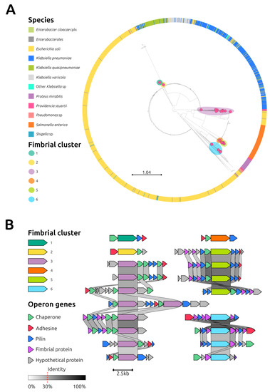 Analysis of fimbrial clusters. (A): Phylogenetic analysis of 1881 usher proteins (1860 downloaded from the RefSeq NCBI Protein DataBase, https://www.ncbi.nlm.nih.gov/protein, accessed on 31 January 2023, using as query “Fimbria” AND “Usher” and 21 identified in isolate 41). Metadata colors depicting the hosting species are explained in the legend. The 21 usher proteins identified in isolate 41 are indicated by magenta dots; the colored halos around magenta dots indicate the corresponding fimbrial cluster. (B): Synteny analysis of the operons belonging to the 6 fimbrial clusters identified in Providencia stuartii isolate 41. Arrows represent genes and are color-coded according to the legend. Grey links represent the nucleotide homology between genes. The nucleotide identity threshold was set to 30%, and higher identity is reflected by a darker shade of gray.
