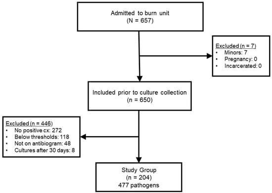 The study was approved by both the University of Tennessee Health Science Center and Regional One Health Research Institute Institutional Review Boards (20-07615-XP). This dual IRB-approved study was an observational case series of patients admitted to a single verified burn center between 1 January 2018, and 31 December 2019. Patients were excluded for any of the following: (1) no positive bacterial cultures obtained, (2) less than 18 years of age, (3) incarcerated, (4) pregnant, (5) cultures collected after 30 days of admission, (6) culture results below quantitative thresholds, or (7) isolates not reported on the automated antibiogram (e.g., no comparison could be made). Patients were screened initially by reviewing burn center admission logs during the study period, and exclusion criteria were applied to generate a final sample of patients and cultures.