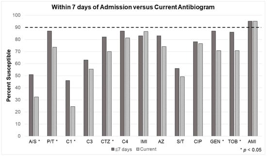 Suggested Gram-negative coverage was significantly altered after manual data collection and application of the additional rules. (Table 3, Table 4, Table 5 and Table 6 and Figure 2, Figure 3 and Figure 4) Table 3 and Table 4 demonstrate changes in the antibiogram susceptibilities with the addition of the 7-day rule, where cultures taken after the first seven days of admission were not considered in the EA. Susceptibilities significantly improved for ampicillin/sulbactam, piperacillin/tazobactam, cefazolin, ceftriaxone, gentamicin, and tobramycin. Amikacin in vitro activity remained excellent. While improved, the unit’s empiric Gram-negative coverage (e.g., cefepime) still fell below the minimum susceptibility goal (90%).