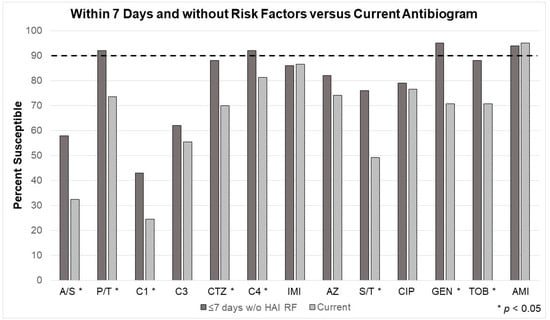 The susceptibility changes for the second model, considering the 7-day rule and excluding patients with risk factors for HAI. Susceptibilities significantly improved for nearly every tested antibiotic (ampicillin/sulbactam, piperacillin/tazobactam, cefazolin, ceftriaxone, cefepime, sulfamethoxazole/trimethoprim, gentamicin, and tobramycin). (Table 4 and Figure 3) Most notably, the unit’s current Gram-negative agent, cefepime, was adequate for monotherapy coverage. Piperacillin/tazobactam, cefepime, gentamicin, and amikacin were the only antimicrobials that surpassed the minimum 90% threshold, according to in vitro testing.