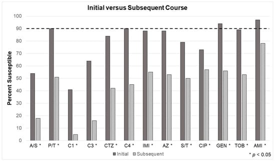 Figure 4. Comparing cumulative ‘bacteria by antibiotic’ sensitivities for clinically-relevant pathogens according to whether the patient received an initial course of antibiotics (e.g., initial), had a prior course, or at least seven days of a previous antibiotic (e.g., subsequent). AMI, amikacin; A/S, ampicillin/sulbactam; The dotted line indicates the 90% threshold at which it is recommended to consider an alternative agent or dual empiric therapy. AZ, aztreonam; C1, cefazolin; C3, ceftriaxone; C4, cefepime; CIP, ciprofloxacin; CTZ, ceftazidime; GEN, gentamicin; IMI, imipenem; P/T, piperacillin/tazobactam; TOB, tobramycin; S/T, sulfamethoxazole/trimethoprim.