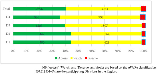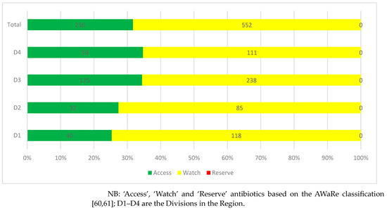 Antibiotic dispensing practices as per the WHO AWaRe classification are shown for each Division in Figure 1. As can be seen, most of the antibiotics dispensed were from the ‘Watch’ category (59.2%) followed by the ‘Access’ category (40.3%), with a few also from the ‘Reserve’ category (0.5%).