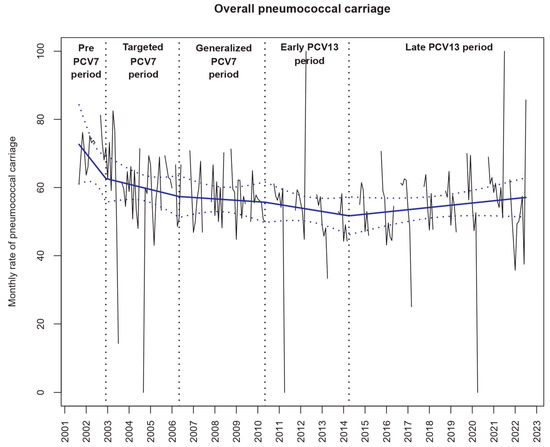 Evolution of overall Streptococcus pneumoniae (Sp) carriage in children with acute otitis media enrolled during the study period (n = 17,136). Notes: The black lines show the observed data. Using a segmented regression model, we estimated the rates over time (blue slope lines) and its 95% confidence interval (blue dotted lines). The “pre-PCV7 period” was from September 2001 to December 2002, the “targeted PCV7 period” from January 2003 to May 2006, the “PCV7 period” from June 2006 to May 2010, the “early PCV13 period” from June 2010 to April 2014 and the “late PCV13 period” from May 2014 to July 2022.