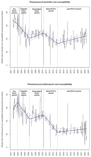 Evolution of penicillin and erythromycin non-susceptibility among the pneumococcal strains isolated from nasopharyngeal carriage. Notes: The black lines show the observed data. Using a segmented regression model, we estimated the rates over time (blue slope lines) and its 95% confidence interval (blue dotted lines). The “pre-PCV7 period” was from September 2001 to December 2002, the “targeted PCV7 period” from January 2003 to May 2006, the “PCV7 period” from June 2006 to May 2010, the “early PCV13 period” from June 2010 to April 2014 and the “late PCV13 period” from May 2014 to July 2022.