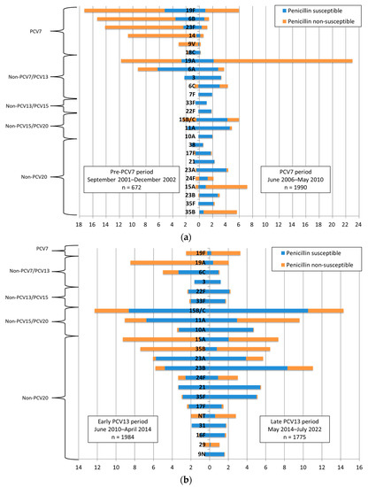(a,b). Serotype distribution during the pre-PCV7, PCV7, early PCV13 and late PCV13 periods. The “pre-PCV7 period” was from September 2001 to December 2002, the “PCV7 period” from June 2006 to May 2010, the “early PCV13 period” from June 2010 to April 2014 and the “late PCV13 period” from May 2014 to July 2022. Note: Serotypes accounting for <1% in both periods are not shown. PCV7, 7-valent pneumococcal conjugate vaccine; PCV13, 13-valent pneumococcal conjugate vaccine; NT, non-typable.