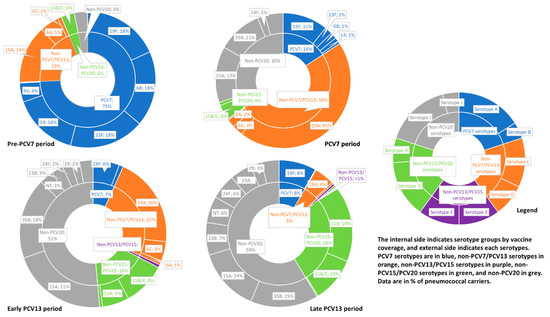 The following supporting information can be downloaded at: https://www.mdpi.com/2079-6382/12/6/1020/s1, Supplementary Table S1: Serotype distribution during the pre-PCV7, and PCV7 periods; Supplementary Table S2: Serotype distribution during the early PCV13, and late PCV13 periods; Supplementary Table S3: Carriage and penicillin non-susceptibility of emerging serotypes identified during the late PCV13 period; Supplementary Table S4: Factors affecting carriage of antibiotic non-susceptible S. pneumoniae by univariate and multivariate analysis during the late PCV13 period; Supplementary Table S5: Estimation of the impact of non-pharmaceutical intervention implementation on carriage and antibiotic resistance of Streptococcus pneumoniae; Supplementary Figure S1: Evolution of antibiotic use in the 3 months before enrollment, and proportion of broad antibiotic among the children enrolled in the study; Supplementary Figure S2: Evolution of carriage of serotype 15B/C and penicillin non-susceptibility among the isolated strains.; Supplementary Figure S3: Evolution of carriage of serotype 23B and penicillin non-susceptibility among the isolated strains; and Supplementary Figure S4: Evolution of carriage of serotype 11A and penicillin non-susceptibility among the isolated strains.
