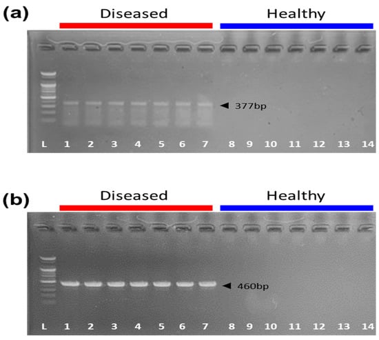 Confirmation of A. pleuropneumoniae and P. multocida using PCR. (a) PCR amplification products with primers for apxIVA-targeted A. pleuropneumoniae. (b) PCR amplification products with primers for kmt1-targeted P. multocida. Columns 1–7: diseased pigs. Columns 8–14: healthy pigs. L: 100 bp DNA ladder.