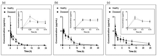 This study involved creating a diseased porcine model through intranasal inoculation. The pigs infected with A. pleuropneumoniae and P. multocida displayed various symptoms, including anorexia, high body temperature, labored breathing, and coughing, all of which are symptoms that are typically observed in diseased pigs []. After the clinical signs were observed, further experiments were conducted on these pigs. The physiological changes brought about by an infection can affect pharmacokinetics []. Therefore, the pharmacokinetic properties of the diseased pigs may have been different from those of healthy animals []. Hence, it was determined that studying the concentration–time profiles of tylosin in the diseased pigs and comparing them with those of healthy pigs would be beneficial for the clinical application of antibacterial therapy.