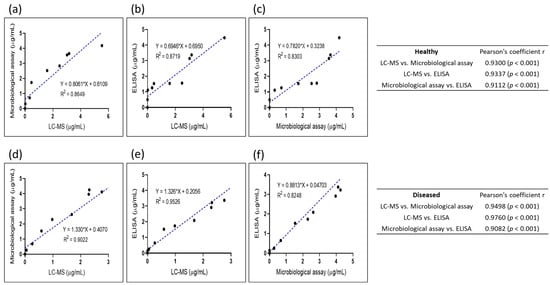 In the healthy pigs, the correlation between the plasma tylosin concentrations obtained using the LC/MS assay and those obtained using the microbiological assay is presented in Figure 3a. The Pearson correlation coefficient of 0.930 (p < 0.001) and the slope of 0.806 indicate a dose-dependent relationship. Likewise, a correlation was observed in the diseased pigs, with a Pearson correlation coefficient of 0.950 (p < 0.001) and a slope of 1.330 (Figure 3d).