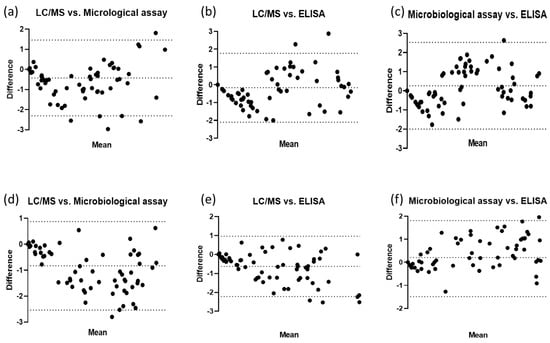 To assess the agreement between the two methods, a Bland–Altman plot was produced, and this displayed the differences between the microbiological assay and ELISA datasets against the mean of the tylosin concentrations obtained using these two methods. The Bland–Altman plot showed good agreement between the microbiological assay and the ELISA for measuring plasma tylosin concentrations; the mean differences in the tylosin concentrations obtained using the two methods were 0.26 in the healthy pigs and 0.20 in the diseased pigs. The limits of agreement were −2.00 and 2.53 in the healthy pigs (Figure 4c) and −1.49 and 1.81 in the diseased pigs (Figure 4f). These results show that both the microbiological assay and the ELISA are rapid, easy, and readily applicable on-site methods that can be used to determine the optimal dose of tylosin.