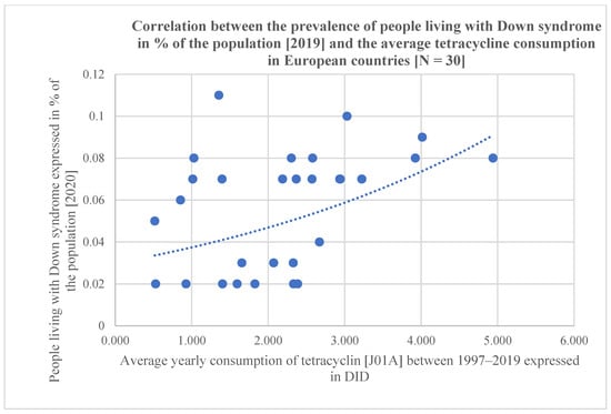 Our comparative analysis using three different statistical methods clearly indicated a strong statistical association between the average yearly consumption (1997–2020) of tetracycline (J01A) and narrow-spectrum, beta-lactamase-resistant penicillin (J01CF) expressed in DID and the prevalence of people living with DS in 30 European countries estimated for 2019. It is suspected that antibiotics (J01A, J01CF)-modified gut microbiome could play some role in the development of DS-related dysbiosis in the mothers delivering babies with DS, and this altered flora also affects the intestinal microbiome of the newborn babies with DS. Although this statistical association could not be applied to the individual level, a theory might be raised that certain molecules produced by the altered maternal microbiome could act as a factor for enhancing the development of chromosome 21 trisomy, which is a possible new insight in the pathomechanisms of DS, but further research is necessary to confirm this possible etiology. It could be theorized that probiotics/prebiotics, taken for an appropriately long period before the planned pregnancy, might stabilize the maternal microbiome, preventing DS-related dysbiosis.