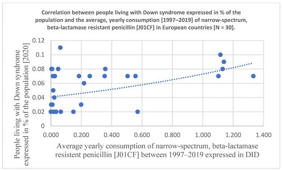 We calculated the average yearly antibiotic consumption in the Defined Daily Dose/1000 inhabitants/day (DID) between 1997 and 2020 of different classes of antibiotics, covering 94% of the total systemic antibiotic consumption in the community featured in the ECDC database [], Comparison was performed with the estimated prevalence of people living with DS for the year 2019 in 30 European countries [].