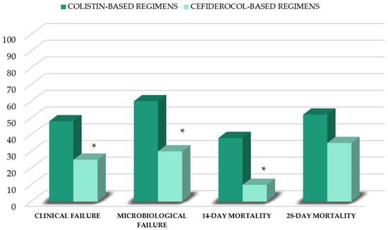 Outcomes of patients stratified by first-line therapy. * p < 0.05 vs. colistin group.