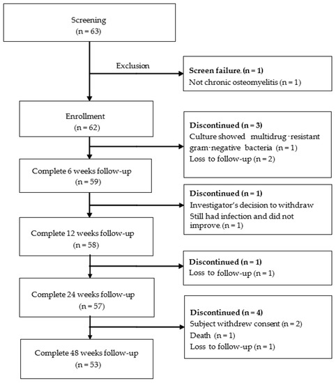 This study was performed in accordance with the Declaration of Helsinki and the International Conference on Harmonization (ICH) for Good Clinical Practice (GCP). The protocol was registered in the Thai Clinical Trials Registry (TCTR20170123002) and approved by the human research ethical committee in each participated center. Patients with chronic osteomyelitis in 12 participating centers in Thailand including Thammasat university, Bhudasothon hospital, Lerdsin hospital, Srinakharinwirot university, Lampang hospital, Khon Kaen hospital, Pathumtani hospital, Suppasitthiprasong hospital, Bhumibol Adulyadej hospital, Paholpolpayuhasena hospital, Hatyai hospital and Prince of Songkla university were eligible to enroll in this multicenter, prospective cohort study. The sample size was calculated using a confidence interval for a proportion (http://www.sample-size.net/sample-size-conf-interval-proportion/, accessed on 16 March 2020) and 59 patients were necessary to provide a study power of 90% with an α of 0.10. Assuming a 5% loss to follow-up for 48 weeks period; hence, the number of participants was 62 patients.
