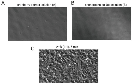 First, we studied the precipitates obtained by mixing saturated solutions of substances with antimicrobial action (see Table 1). Since the precipitation of polysaccharide substances is enhanced by the addition of ethanol equal to 30% v/v, we studied the precipitation process in hydroalcoholic solution. No precipitate was observed in the saturated solutions of the compounds studied (Figure 1A,B; note the absence of precipitate in pure cranberry and chondroitin sulfate solutions at the concentrations shown in Table 1). Surprisingly, when we mixed solutions A and B in a volumetric ratio 1:1 in hydroalcoholic solutions (30%) in the presence of divalent calcium and magnesium ions (see Table 2), we observed the formation of a precipitate (Figure 1C). The divalent ions were added to mimic the intestinal environment [38].