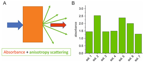 The precipitation process was also characterized by evaluating light scattering phenomena in spectrophotometry measurements (see, e.g., [39]). A reduction in absorption of Cranberry solution was observed by dilution. According to microscopic observations, the addition of chondroitin sulfate (solution 2) increased in scattering related to the formation of the suspension (Figure 2). This increase in absorption/scattering was not observed when cranberry was mixed under the same conditions with NAC (solution 3) and hyaluronic acid (solution 4; Figure 2). Other solutions were created according to Table 2, and the scatter process is shown in Figure 2.
