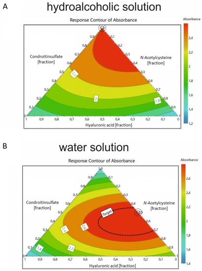 Scattering analysis was performed using multiwell ELISA by evaluating the absorption at 550 nm, using the solutions reported in Table 2 and Table 3. Experimental design was performed by Modde® software package (see Modde® 12, Sartorius AG, Göttingen, Germany, User Guide, www.sartorius.com accessed on 8 February 2023). Starting from a defined cranberry solution, the design aimed to identify the ideal composition mixture of chondroitin sulfate, hyaluronic acid, and N-acetylcysteine that gives the highest scattering in the ELISA test. The composition values and the related absorbances were optimized according to the D-Optimal design combined with a quadratic model and fitted with a multiple linear regression. These methods gave R2 = 0.99 and Q2 = 0.81, where R2 is the percentage variation of the response explained by the model, while Q2 is the percentage variation of the response predicted by the model according to cross-validation. The latter underestimates the goodness of the fit, while the former gives an overestimation. The values of R2 and Q2 and their difference are best when compared with other combination of designs and models available in Modde®.