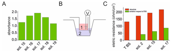 The optimization process was also explored through the variation of cranberry volume starting from solution 15 of Figure 3, reducing the proportion of CB volume (Figure 4, Table 3). This experiment demonstrated that the best combination of volumes was 60:50:25:25 (solution No. 17 Table 3, Figure 4A). The presence of the precipitate was confirmed by measuring the change in electrical resistance by means of a chamber used to measure the transepithelial electrical resistance (TEER), where the solutions under examination were brought into contact at the interface under the same conditions used for the precipitation process. The electrical resistance of the TBS solution stably measured 148 Ω/cm2, while, 60 min after contact with the interface, the electrical resistance increased to 195, 219, and 246 Ω/cm2 for solutions 2, 15, and 17 (Figure 4B,C; Table 2 and Table 3) increasing with respect to the TBS solution by 41.5, 62.8, and 86.7 Ω/cm2, higher values than those reported with xyloglucans [35].