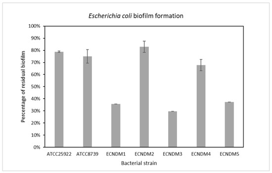 Preliminary experiments were performed to assess the effect of cranberry/chondroitin/NAC/hyaluronic acid precipitate according to solution 17 on the planktonic growth of E. coli clinical and reference strains (Table 4). The solutions containing 30% ethanol (Table 2) were not evaluated in order to avoid interference with the antimicrobial action of ethanol. The obtained results showed that the mixture did not affect bacterial growth. Considering these results, biofilm experiments were performed by testing the precipitate according to solution 17 at a dilution of 1:300 for all strains. As a control, bacteria were cultured in BHI medium without the mixture. Results of cranberry/chondroitin/NAC/hyaluronic acid precipitate in the pre-adhesion period are presented in Figure 5. Results are expressed as the percentage of biofilm formed in the presence of cranberry/chondroitin/NAC/hyaluronic acid precipitate compared to the bacteria grown only in BHI medium. Cranberry/chondroitin/NAC/hyaluronic acid precipitate showed an antibiofilm activity on all tested strains, with a percentage inhibition ranging between 70% and 20%. The strongest inhibition (65–70%) was achieved on the isolates ECNDM1 and ECNDM3, representing strains with resistance spread across more classes of antibiotics used in UTIs treatments (Table 4).
