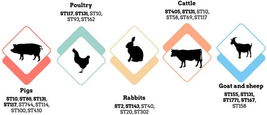 The intense use of antibiotics in livestock production causes the emergence and rapid spread of MDR and ESBLs in E. coli, and may lead to difficult-to-treat infections and constitutes a major reservoir of resistance determinants to most families of antimicrobial agents. High levels of antimicrobial usage were found in the different food-producing animals, especially tetracyclines, fluoroquinolones, β-lactams and aminoglycosides and suggested widespread environmental AMR pollution and, consequently, a possible transmission path of potential multi-resistant pathogens to humans via the food chain. In fact, different clonal lineages were found in pigs, poultry, cattle, rabbits, goats, and sheep; however, it was found that some clonal lineages such as ST131, ST117, among others, are disseminated in different ecological niches. The clonal lineage ST131 is considered a worldwide pandemic clone that has been found in several studies. Therefore, better implementation measures, restricting the use of antibiotics in farm animals, and control and treatment strategies are needed to reduce the emergence and spread of AMR with a scope in the food safety perspective.