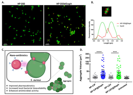 Interaction between nano-antibiotics and S. aureus. (A) Representative fluorescence images of S. aureus Xen29 after 10 min exposure with unmodified (NP-DID, left) or targeted nano-carriers (NP-DID@Staph, right); S. aureus cells were stained with Syto9 (green), and nano-carriers were pre-loaded with fluorescent DID dye (red). (B) Profile lines along a relevant ROI showing the distribution of NP-DID@Staph (red line) on the surface of two undivided S. aureus cells (green line). NP-DID@Staph is heterogeneously distributed on the cell surface and present at the cross-wall cell. (C) Schematic illustrates the binding of nano-antibiotics on the surface of S. aureus and the aggregation phenomenon, potentially improving the biodistribution of antibiotics. Then, the release of the encapsulated drug potentially leads to an efficient antibacterial effect. (D) Quantification of aggregate bacterial volume after 10 min exposure of un-modified nano-antibiotic (NP-LEV and NP-CIP) and targeted nano-antibiotic (NP-LEV@Staph and NP-CIP@Staph). The complementation of antibodies on the nano-antibiotic surface significantly increased the clumper aggregate volume. Statistical analyses were performed using the Mann-Whitney test, *** p <0.001, **** p < 0.0001.