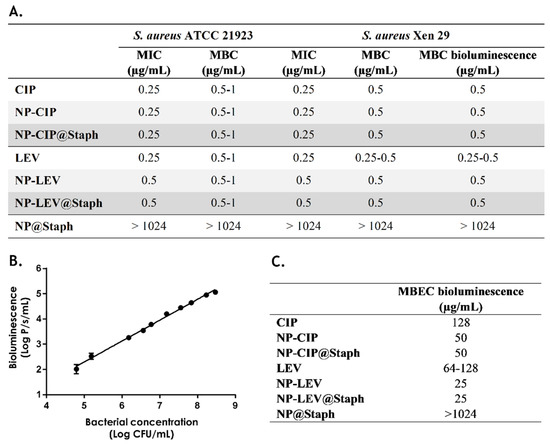 In vitro antimicrobial studies of nano-antibiotic formulations. (A) Minimum inhibitory concentration (MIC) and minimum bactericidal concentration (MBC) of free-form antibiotics and nano-antibiotics against S. aureus ATCC 21923 and Xen29; n ≥ 5. (B) Correlation between bacterial density (CFU/mL) and bioluminescence intensity (P/s/mL); n = 3. (C) Bioluminescence-based minimum biofilm eradication concentration (MBEC) of free-form antibiotics and nano-antibiotics against S. aureus Xen29 biofilm; n ≥ 5.