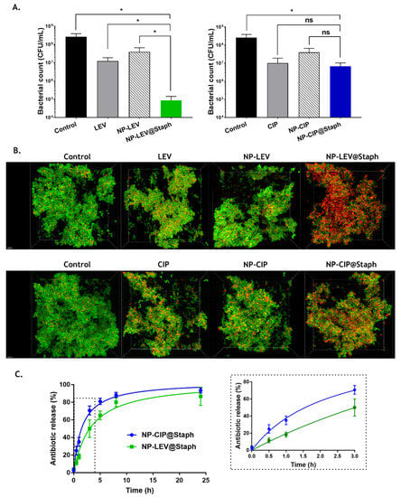 It is important to acknowledge that these conclusions are based on our in vitro studies. While we have observed differences in the drug release profiles, we cannot exclude the possibility of variations in the number of NP-LEV@Staph and NP-CIP@Staph particles adhering to bacteria after the incubation period. Quantifying these targeted nano-antibiotics on the bacterial surface in future experiments is necessary to investigate this aspect further [53,54]. Moreover, conducting in vivo animal studies is essential to gain a more comprehensive understanding of the therapeutic effects of nano-antibiotics. In the treatment of infections, it is commonly recommended that someone administers a standard systemic dose of free antibiotics to ensure their bioequivalence and therapeutic effectiveness, even in the context of targeted therapy. In this case, we hypothesize that the observed burst release following the administration of nano-antibiotics could potentially provide a standardized systemic dose of antibiotics, ensuring their bioequivalence. Subsequently, the sustained release pattern, in conjunction with the targeting ability of nano-antibiotics, would result in a localized and high concentration of antibacterial agents at the infected site, thereby enhancing the treatment’s efficacy.