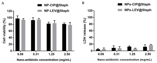 Cytotoxicity evaluation of nano-antibiotics. Estimated cell viability (A) and LDH release (B) of A549 cells after 24 h exposure to with NP-CIP@Staph and NP-LEV@Staph. Data are presented as mean + SD; n = 6.