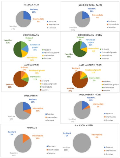 - Ribera, A.; Ruiz, J.; Jiminez de Anta, M.T.; Vila, J. Effect of an efflux pump inhibitor on the MIC of nalidixic acid for Acinetobacter baumannii and Stenotrophomonas maltophilia clinical isolates. J. Antimicrob. Chemother. 2002, 49, 697–698. [Google Scholar] [CrossRef] [PubMed]