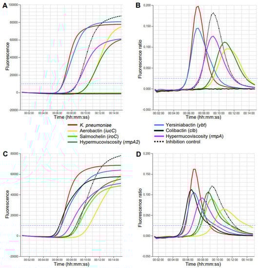 Detection of K. pneumoniae virulence genes by LAMP on the Genie HT instrument within 15 min. (A,B) Isolate 1 of ST395 with a virulence score of 4. (C,D) Isolate 7 of ST23 with a virulence score of 5. The thresholds of fluorescence level (A,C) and amplification rate (B,D) are marked with a broken light blue line.