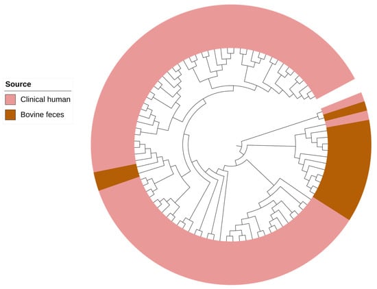 In the core-genome phylogenetic analysis, P. aeruginosa isolates from bovine sources clustered separately from those obtained from humans. Similar observations have been reported in Brazil, where P. aeruginosa recovered from healthy bovine urine samples segregated from human clinical urinary tract isolates []. These observations might be associated with a prolonged association and adaptation of these isolates within their respective environmental hosts. P. aeruginosa is known for its remarkable ability to adapt to diverse ecological niches, from soil to various living hosts [,]. Genes associated with metabolism and pathogenesis constitute the core-genome of P. aeruginosa, whereas genes required to adapt to various niches constitute the accessory genome. These genes were found to cluster in certain loci referred to as ‘regions of genomic plasticity’ [,]. In this study, P. aeruginosa recovered from the beef production system carried ARGs conferring resistant to chloramphenicol (catB7), β-lactams (blaOXA-50), fosfomycin (fosA), aminoglycosides (aph(3′)-Iib), and cephalosporins (blaPDC-55, blaPDC-374). These ARGs were also found in the genomes of human clinical isolates and were mapped on chromosomes in both bovine and human clinical isolates. In P. aeruginosa, the type IV pilus uptakes foreign DNA during transformation events [,]. The accessory genome can be distinguished from the core genome by its aberrant GC content, codon usage, and tetranucleotide usage []. The GC content of P. aeruginosa (~66.3%) is mostly higher than the foreign DNA. Over time, the acquired DNA may lose the sequence compositional difference that distinguishes it from the core genome of P. aeruginosa as it undergoes the same selective pressure as the core genome [].