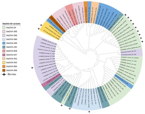 Phylogenetic tree of carbapenemase gene blaOXA-50 variants identified in Pseudomonas aeruginosa isolates from human and bovine sources, constructed using MAFFT.
