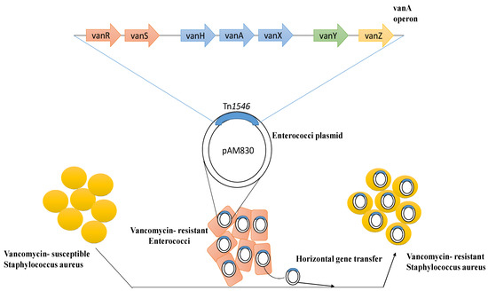 However, the increased usage of vancomycin has resulted in the establishment of two other forms of S. aureus that show reduced susceptibility or resistance to glycopeptides. The first one, known as VISA, has a thicker cell wall, along with insufficient cross-linking in the cell wall, which causes a buildup of acyl-d-alanyl-d-alanine (X-d-Ala-d-Ala) targets that entrap glycopeptides at the periphery. The second form is VRSA, which is due to transposon Tn1546-carrying the vanA operon acquired from Enterococcus species, resulting in the establishment of high-level resistance (Figure 1) [52,53,54]. The risk of transmission to S. aureus and other susceptible medically significant microbes due to the vancomycin-resistant enterococci is high [15].