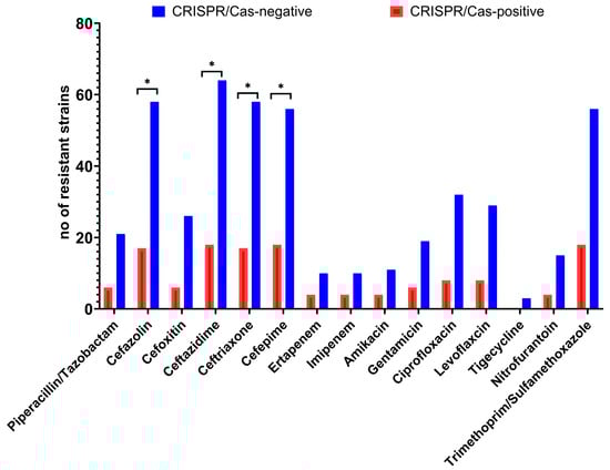 Drug resistance patterns between CRISPR/Cas-positive and -negative isolates of K. pneumoniae. *: significant difference (p < 0.05).