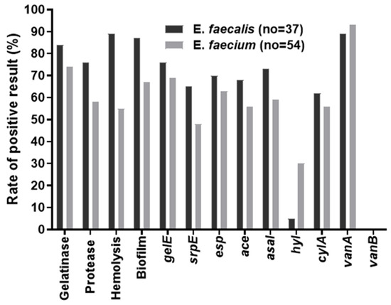 - Banerjee, T.; Anupurba, S. Prevalence of virulence factors and drug resistance in clinical isolates of Enterococci: A study from North India. J. Pathog. 2015, 2015, 692612. [Google Scholar] [CrossRef]