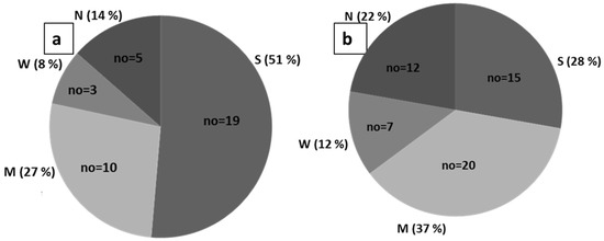 Pie chart revealing the different strength of the biofilm-producing ability of vancomycin-resistant enterococcal isolates (a) E. faecalis (n = 37), (b) E. faecium (n = 54). S: strong, M: moderate, W: weak, N: negative.