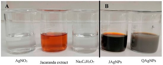 (A) Precursors: Jacaranda extract (J. mimosifolia), silver nitrate (AgNO3), and sodium citrate (Na3C6H5O7); (B) silver nanoparticles biosynthesized with Jacaranda extract (JAgNPs) and chemical synthesis (QAgNPs). The changes in the colors of the precursors, from transparent and light brown to dark reddish brown for the JAgNPs and from transparent to yellowish gray for the QAgNPs, reveal the production of nanoparticles.