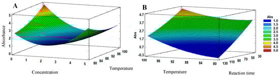 Estimated response surface of QAgNPs: (A) at a predefined reaction time of 75 min, the interaction between the silver nitrate and the reaction temperature can be observed, where 1 mM and 100 °C are the factors that resulted in the highest absorbance; (B) interaction between the reaction time and temperature concerning the increase in absorbance, with a predetermined concentration of 1 mM. The changes in the absorbances are represented by colors ranging from blue (1 abs) to red (5 abs).